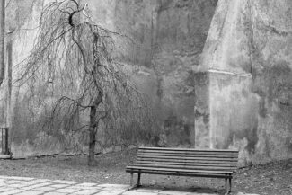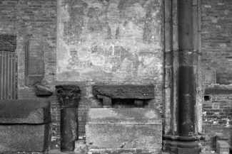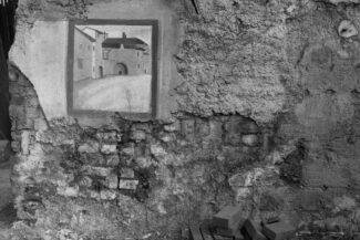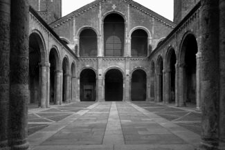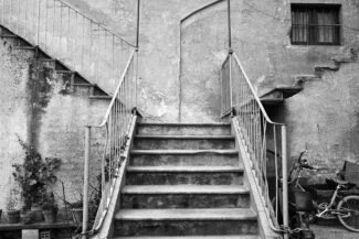 Con sguardo acuto ricerca una propria interpretazione dei luoghi, dalle vedute più ampie al dettaglio, creando analogie che si rifanno alla storia con un effetto narrativo, tradotto in un’ampia scala di grigi che esalta le strutture,